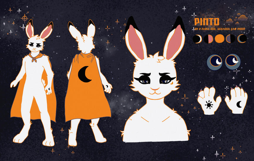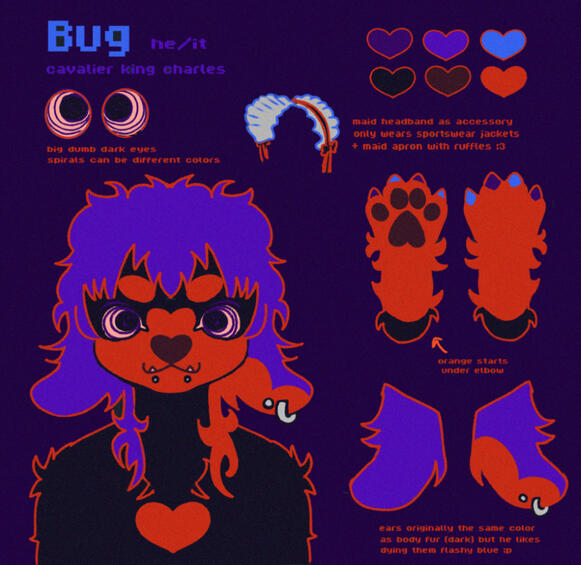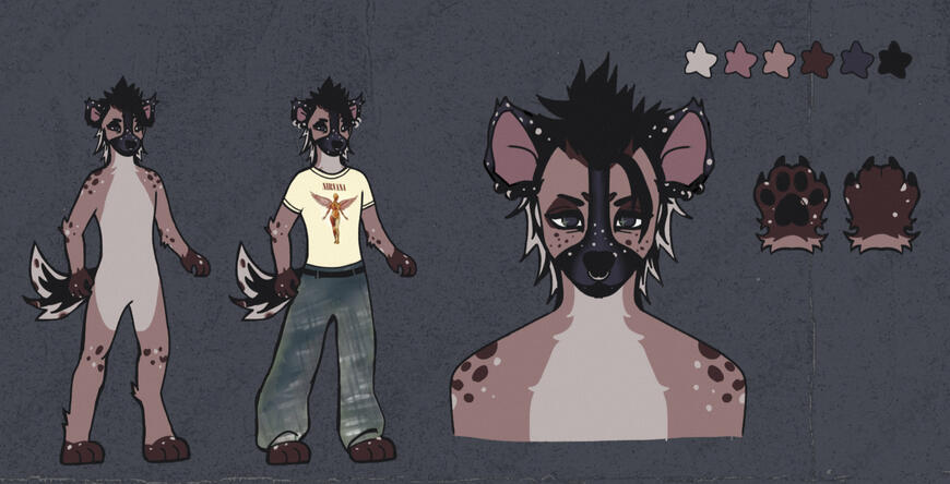 simple includes: a head shot of your character, paws/fins/other, color palette.complete includes: a bust shot of your character, eyes, paws/fins/other, ears, color palette, flags if wanted, notes for fun facts, etc.if your fursona is not designed yet, i can help you design it based on your preferences! :)